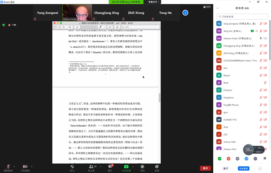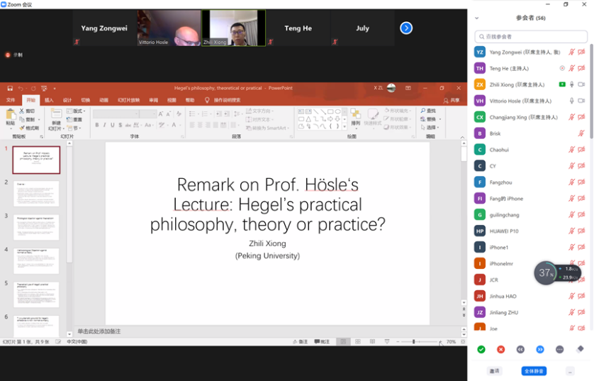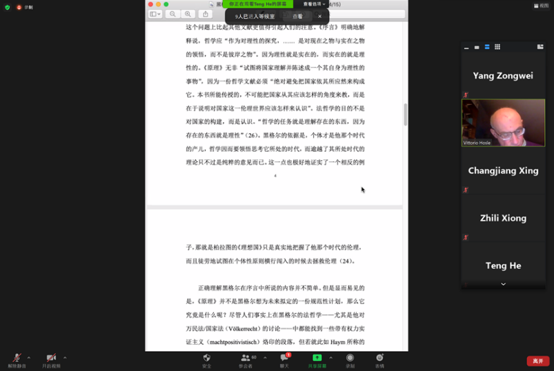 Vittorio Hösle教授发言后,北京大学博士后熊至立对报告做了点评,就其对规范性与描述性的划分提出疑问,现场参与者反应热烈,纷纷提出了许多问题与Vittorio Hösle教授讨论,会议直至北京时间23:30结束。