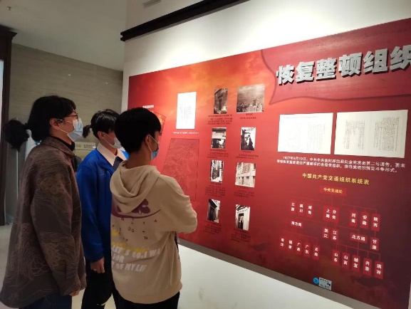 参观中,同学们见证了红军当时所面临的艰苦条件以及革命形势的严峻性,明白了右倾机会主义的严重危害,同时感受到党中央应对危机迅速组建临时中央政治局和确定土地革命、武装斗争的总方针的关键性。在一件件陈列的历史文物、一张张真实的史料图片中,大家充分地认识到“八七会议”作为中国共产党革命路线的重要转折点的历史性作用,并感慨于党中央在生死关头仍然能够拨乱反正、重新指挥革命的强大领导力。