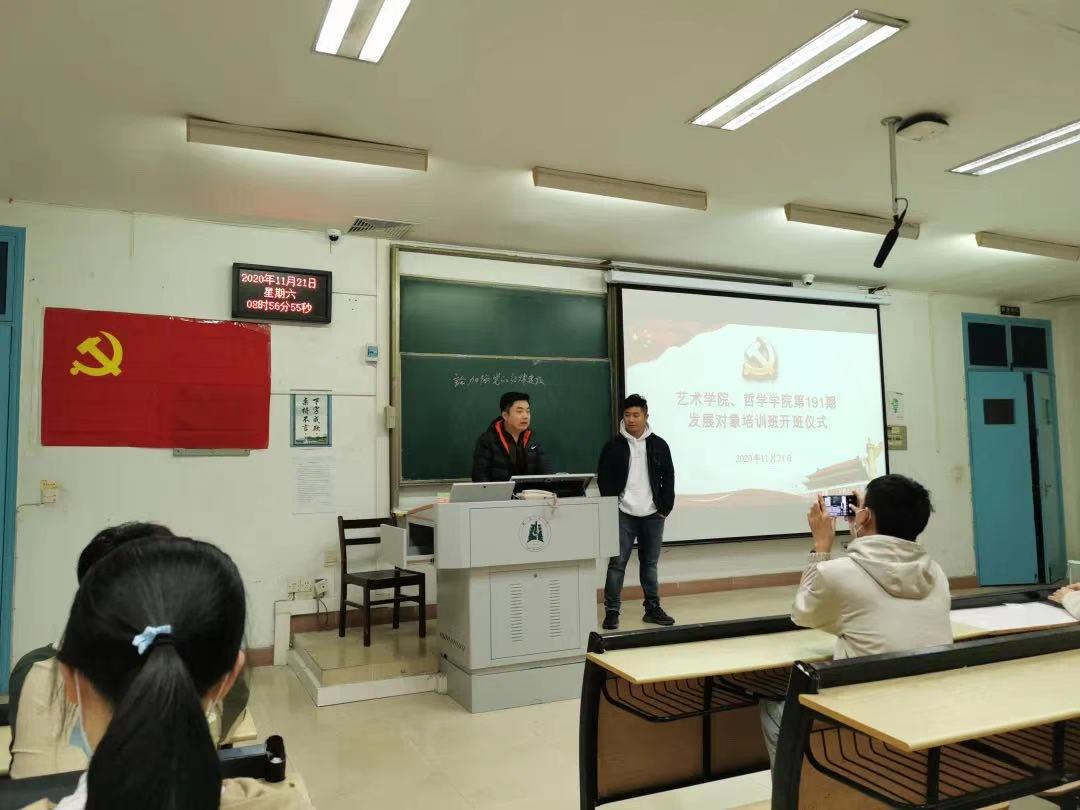 为加强对党员发展对象的教育培训,结合“不忘初心、牢记使命”主题教育,引导发展对象进一步学习贯彻习近平新时代中国特色社会主义思想的理论体系,深刻把握习近平总书记系列重要讲话精神,始终在思想上行动上与党保持高度一致,英国上市公司官网365分党校、艺术公司分党校于2020年11月21日上午9点,在四号教学楼307教室举行了第191发展对象培训班,英国上市公司官网365团委书记董力、艺术公司团委书记杨珂以及英国上市公司官网365、艺术公司全体发展对象培训班成员参加此次开班典礼。