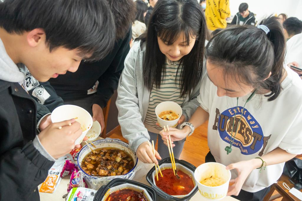 王振老师的红烧肉肥瘦相间、色泽金黄,令人食指大动,满满一大盘不一会儿就“光盘”了;倪霞老师带来的两盒鸡米花也很受员工们的欢迎,没多久就被他们“一抢而光”;副书记许媛带来的烧烤荤素搭配,香气四溢。不少员工纷纷拿出手机拍下美食,和老师合影,记录这美好温情的瞬间。“今天大家围坐在一起看电影、玩桌游,现场活动气氛很欢乐。老师们亲自下厨做菜给同学们吃,大家也趁此机会和老师拍了照片,互相有了更深入的交流。”2020级英国上市公司官网365员工朱晓萍希望可以多多举办类似于这样的公司活动,这种别出心裁、“接地气”的活动不仅能促进同学们之间的感情,帮助员工转换心情,而且也能增进师生之间的了解。