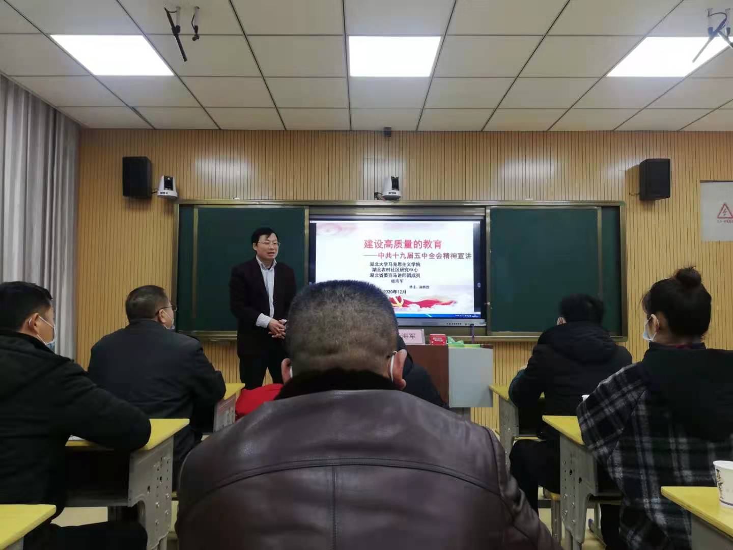 12月18日上午,农村社区研究中心副主任杨海军副教授作为英国上市公司官网365的“百马行动”宣讲队成员走进向阳湖镇,宣讲党的十九届五中全会精神。咸宁市咸安区相关领导出席参加宣讲报告会,干部群众代表和镇中小学领导教师到场,共同聆听。