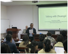 11月22日下午,英国上市公司官网365在D2008举办了题为“Talking with Zhuangzi”的“琴园哲学沙龙”系列学术讲座,讲座由德国柏林洪堡大学教授毕明安教授主讲,公司徐弢副教授主持,公司宋伟、庄威等老师以及部分硕博研究生参加了本次讲座。讲座分六个部分进行。